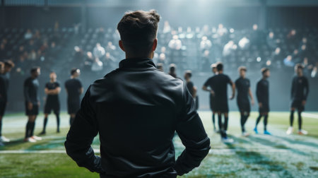 A dedicated coach stands on the field, keenly observing a warm practice session as athletes engage in drills, emphasizing teamwork and skill enhancement.