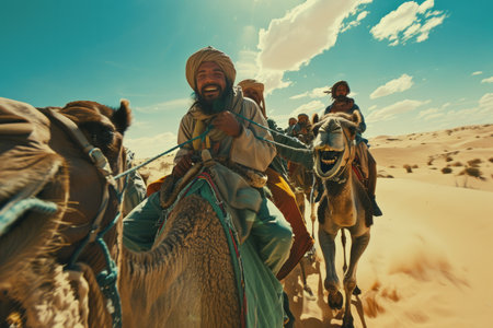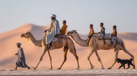 Nomads traversing a vast desert with camels