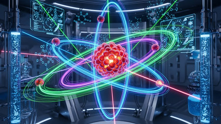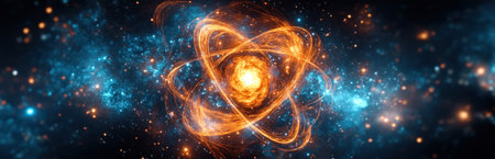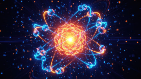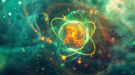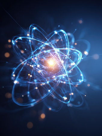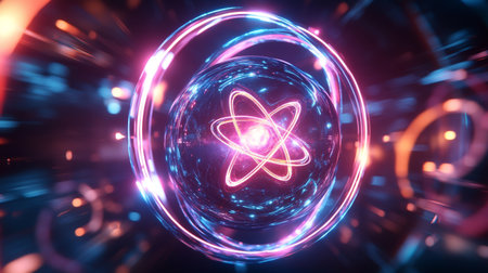 A vivid atomic structure depicting swirling energy and glowing particles, symbolizing scientific exploration and discovery.