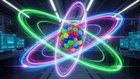 Colorful depiction of protons and neutrons orbiting a nucleus creating a tightly packed core