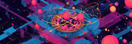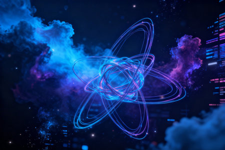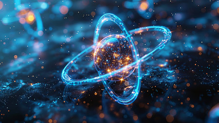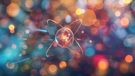 This digital illustration showcases an abstract atomic model with luminous particles and swirling orbits, representing concepts from science and research.