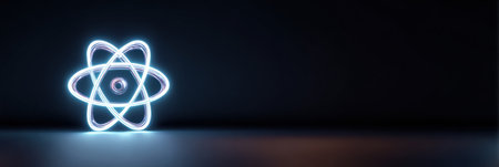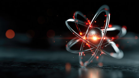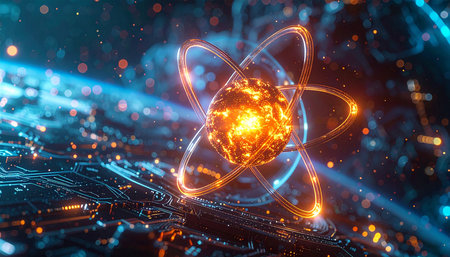 Glowing atom structure with electrons rotating around the nucleus is presented in a dark background emphasizing science and technology themes.