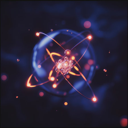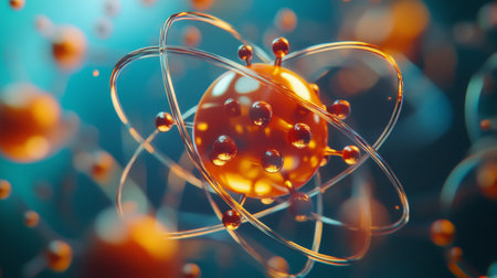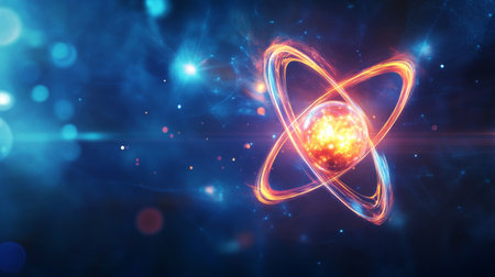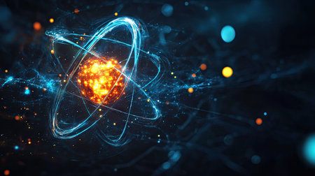 A vibrant visualization of an atom, where glowing orange electrons orbit a powerful central nucleus against a blue bokeh background. This abstract image represents the core of scientific discovery, the boundless potential of nuclear energy, and the futuristic frontier of quantum physics research.