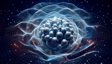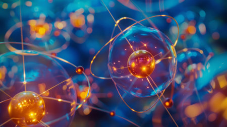 Abstract Conceptual Illustration of Atoms and Nuclei Surrounded by Glowing Energy in Cosmos
