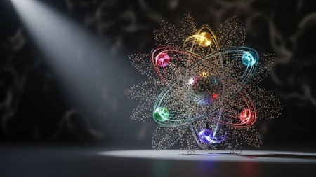 Educational illustration of atom model with detailed protons, neutrons, and electrons in orbit, bright glowing effects