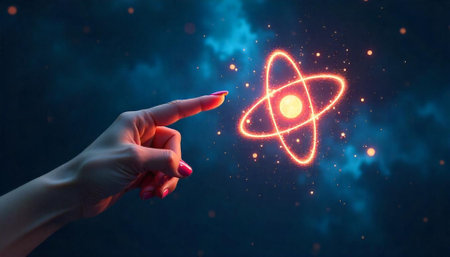 Female hand interacts with a glowing atom illustration