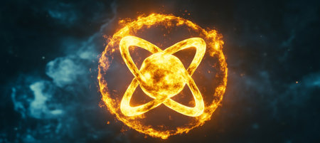 Abstract representation of an atom's nuclear fusion, with glowing orange and blue flames swirling around the core. The background is dark space filled with stars, creating a sense of cosmic energy. --ar 31:10 --v 6.1 Job ID: 936abfa2-23e1-48d5-8e18-9149a671c9c2