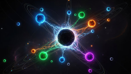 An abstract illustration depicts a central dark sphere radiating with bright energy. Surrounding it are colorful, glowing orbs interconnected by lines of light. The composition features a dark background, highlighting the vivid colors. This image is suitable for scientific visualizations, technological concepts, and design projects.