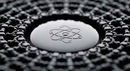 Close-up of an atom symbol on a round surface surrounded by a grid, representing science, technology, and innovation.
