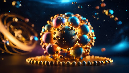Abstract Conceptual Illustration of Atoms and Nuclei Surrounded by Glowing Energy in Cosmos