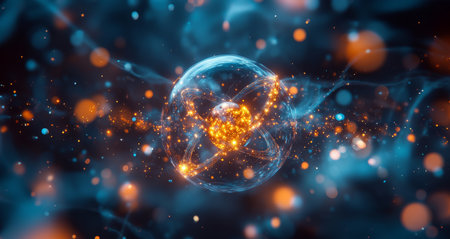 A model of an atom with an orange nucleus and glowing white electrons orbiting in a dark background