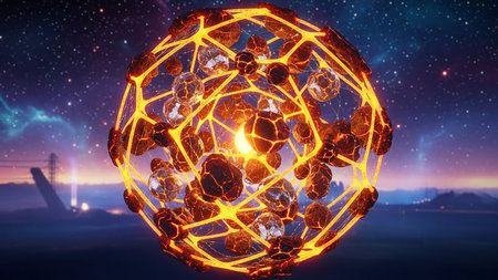 An abstract glowing geometric sphere composed of molten rock and crystal fragments in space