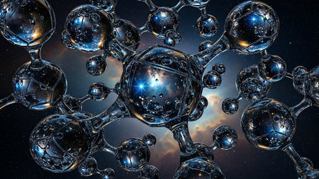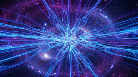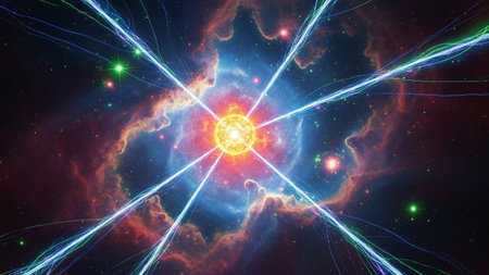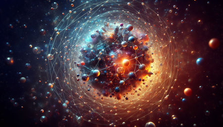 Complex visual of atomic structures intertwined with cosmic elements in vibrant colors and patterns.