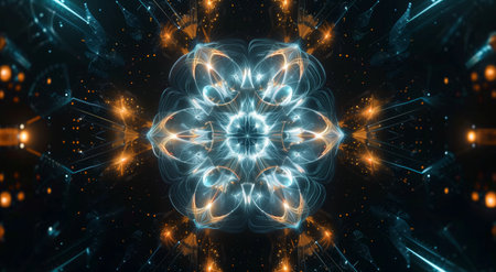 A luminous circular form pulsates with fiery hues and intricate geometric patterns, illustrating dynamic data flow and high-tech energy visuals.