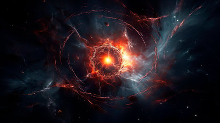 Birth of supernova star. Big bang explosion in outer space. The genesis of a new planet in the galaxy. Expansion of universe. Gas dust clouds nebula background.