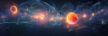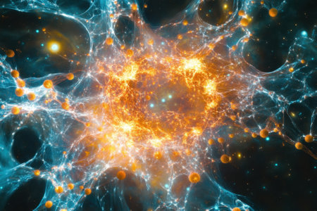 Abstract Conceptual Illustration of Atoms and Nuclei Surrounded by Glowing Energy in Cosmos