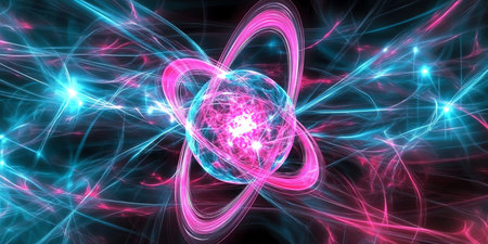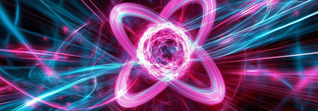 A vibrant depiction of a quantum core, where neon pink and blue light trails orbit a central energy source. This abstract image visualizes the fundamental power of atomic particles, representing concepts of scientific breakthrough, futuristic technology, and the complex beauty of the subatomic world.