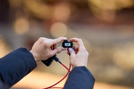 Hands holding action camera with red cable outdoors.
