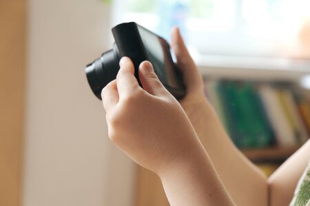 Hands of a little child taking pictures with digital camera