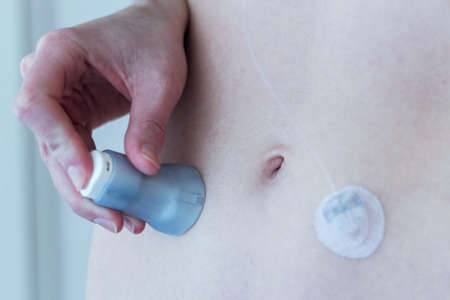 Diabetic man with an insulin pump connected in his abdomen and keeping the insulin pump on his belt. Diabetes concept.