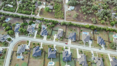 Aerial view of tightly located family houses in Florida closed suburban area. Real estate development in american suburbs