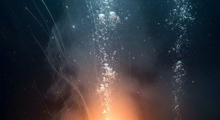 An abstract and atmospheric underwater scene where streams of bubbles rise from a warm, glowing light source at the bottom. The effervescence travels through dark, murky water, creating a sense of mystery, depth, and dynamic movement.