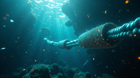 Close-up of high-tech underwater fiber optic cable connection with glowing particles in deep ocean environment. Data transmission concept.