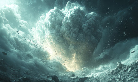An underwater eruption occurs, sending enormous clouds of debris and water into the air, creating a breathtaking display of nature's power beneath the ocean's surface.