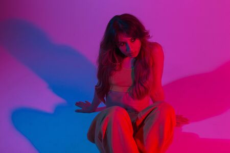 Fashion model pretty young beautiful woman in fashionable youth sports clothes is resting in a room with a glamorous bright pink light. Trendy girl sits in the studio with neon multi-colored glitter.