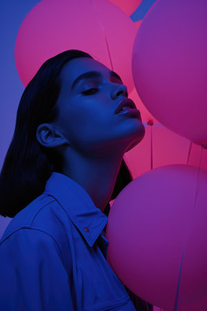 Young woman with flowing hair enjoys a moment with a joyful expression surrounded by bright neon colors in a soft lighting setting.