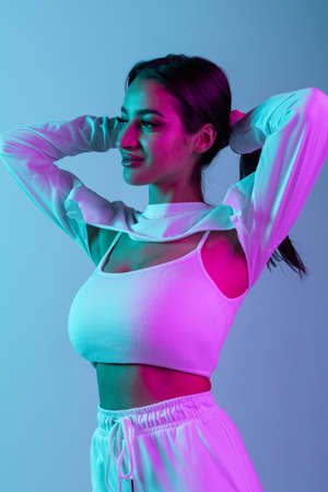 Cool young confident girl with long healthy hair posing in colorful neon studio light. Modern woman beauty portrait