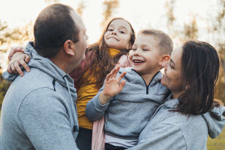 Happy family walking in autumn park. Mother, father and children spending time together.