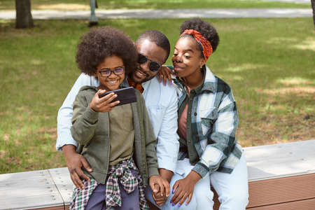 A happy family taking a selfie in a park, with trees in the background, capturing a joyful moment together