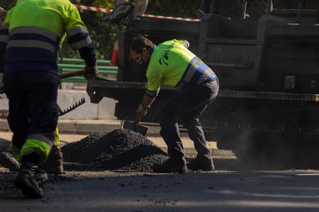 Madrid, Spain - May 5, 2021: Maintenance, rehabilitation and paving of streets in the downtown area of Madrid, Retiro district, using asphalt finisher, and other machines and tools.