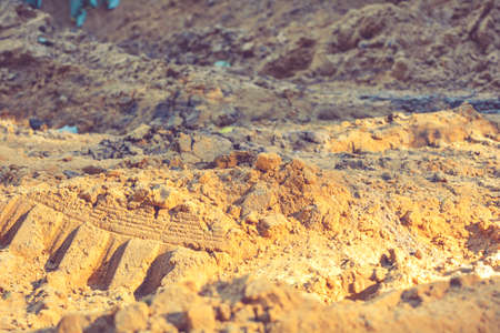 Close-up of ground with dirt and sand soil in random with small stones. Randomly sketched dirty loose coarse sand interspersed with debris and small gravel