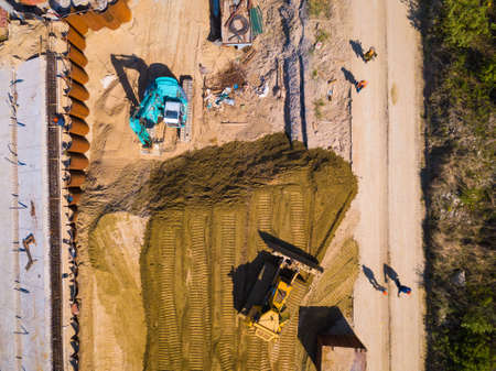 Aerial photo of trucks and bulldozers on construction site in Treillieres, France