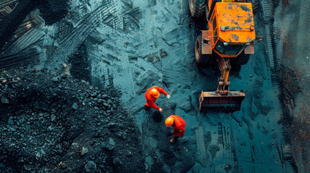 Yellow excavator loads coal into crusher. Open pit mine, extractive industry, top view aerial drone