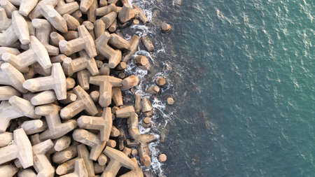 Aerial drone view of a breakwater. breakwater in the sea, a collection of concrete breakers