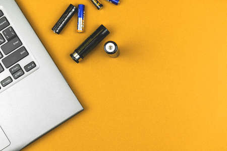Laptop battery repair workspace background, maintenance and tech service concept, top view
