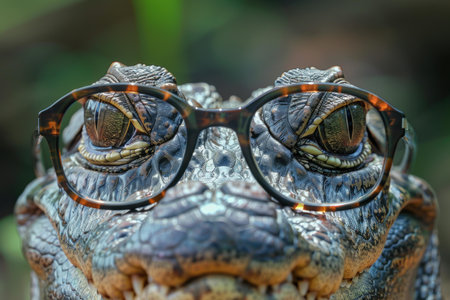 Humorous closeup of an alligator wearing stylish glasses in natural surroundings