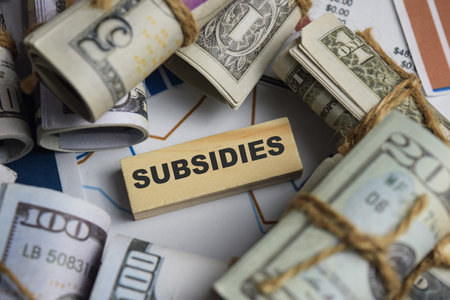 A person is writing the word Subsidies on a piece of paper. The image also includes a calculator and a few coins