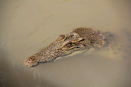 An overhead shot presents a crocodile floating in dark water, its skin displaying intricate textures and patterns. The image shows the reptile's features, including its eyes and the scales that run down its back. The visual characteristics and composition suggest the image could be used for various commercial or editorial purposes.