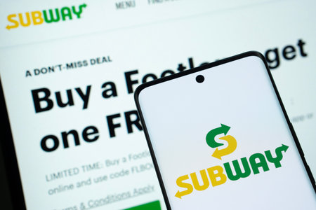 Dhaka, Bangladesh - 18 March 2025: The logo of the subway is displayed on a smartphone screen, and the website subway is visible on a computer screen in the background.