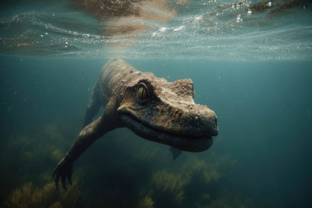 An ambitious water dinosaur taking the plunge diving deep in its search for food.. AI generation