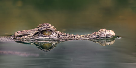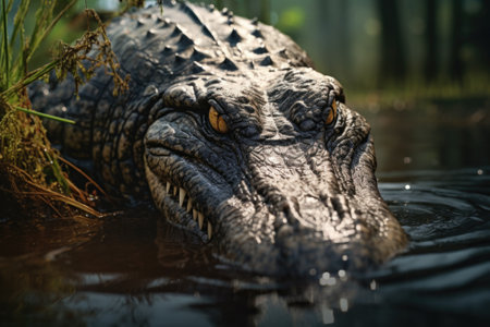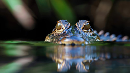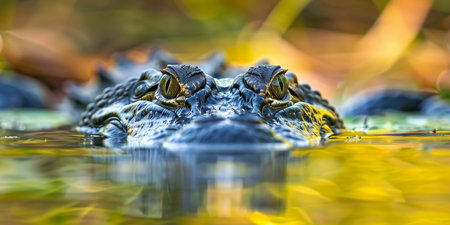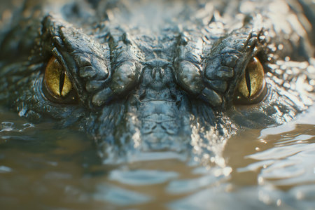 Close up view of a crocodile lurking just beneath the water's surface, with its watchful eyes peering out, showcasing its stealthy nature