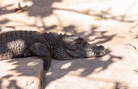 Close-up of the jaw of a huge crocodile lying in the jungle at the zoo. Large white sharp teeth stick out of its mouth. A dangerous animal. A carnivorous hunter lurking in anticipation of its prey.