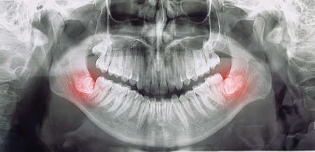different types of wisdom teeth problems concept, problem teeth X-ray image scanned, panoramic image