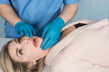 Close-up of unrecognizable nurse palpating chin of black man with stubble at medical checkup