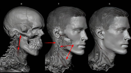 This detailed anatomical illustration showcases the human skull and neck structures from multiple angles, highlighting muscles and nerves for educational purposes.