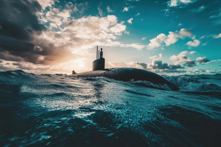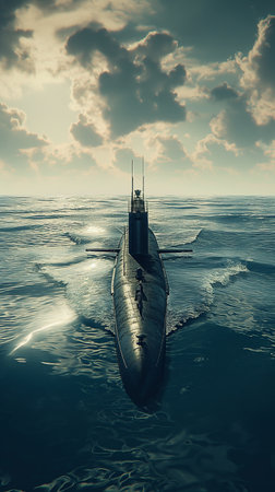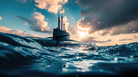 A submarine emerges from the deep, its sleek silhouette breaking the surface of the ocean. The sun casts a golden glow on the water, while clouds drift across the sky.